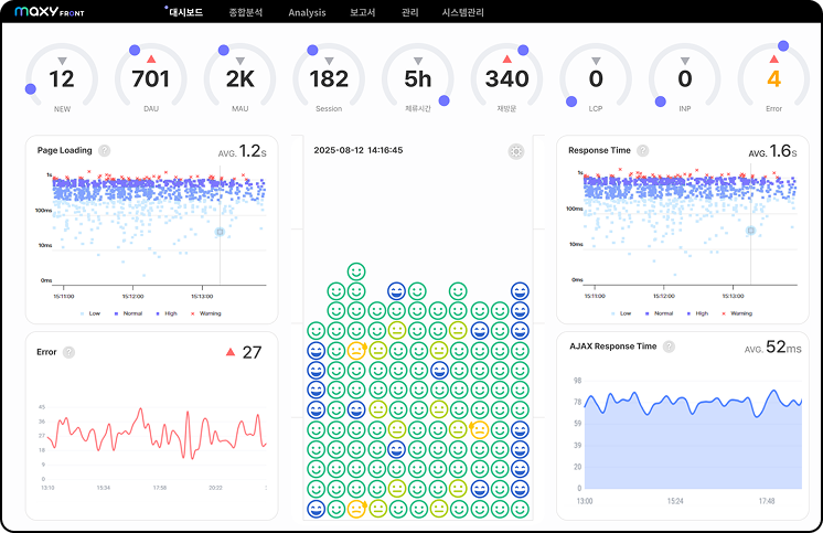 모든 프론트 구간의 개별 고객 성능 만족도를 측정하여 사용성과 성능 저하 발생 시 고객 환경 기준에서의 원인을 추적할 수 있도록 지원합니다.